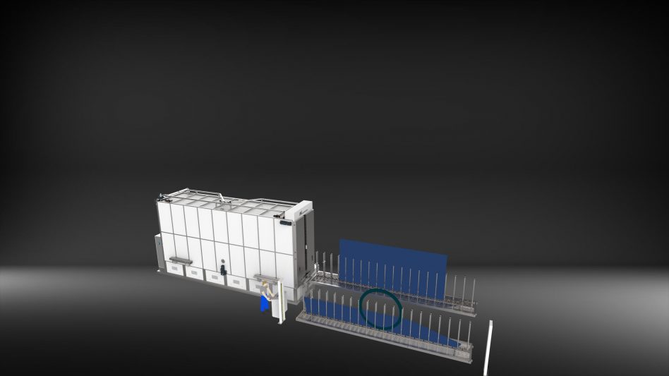 Bewegliche Rahmen überstreichen die gesamte Länge der Teile, um eine gleichmäßige Behandlung zu gewährleisten.