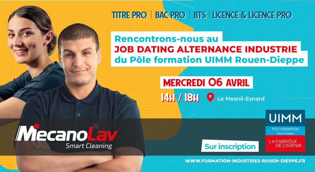 Dann treffen Sie das MecanoLav-Team, um sich über Ihre Zukunftspläne auszutauschen, während des Job-Datings „Alternance Industrie“ des Ausbildungszentrums UIMM Rouen-Dieppe! Wir bieten Ihnen die Möglichkeit, sich in unser Team zu integrieren und ein duales Studium zu absolvieren.